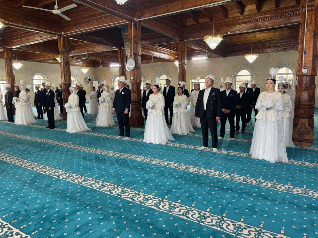 Алгач борбордук мечитте жаш жубайлардын нике аземи өтүп, андан кийин үйлөнүү той жана маданий программа уланмакчы.