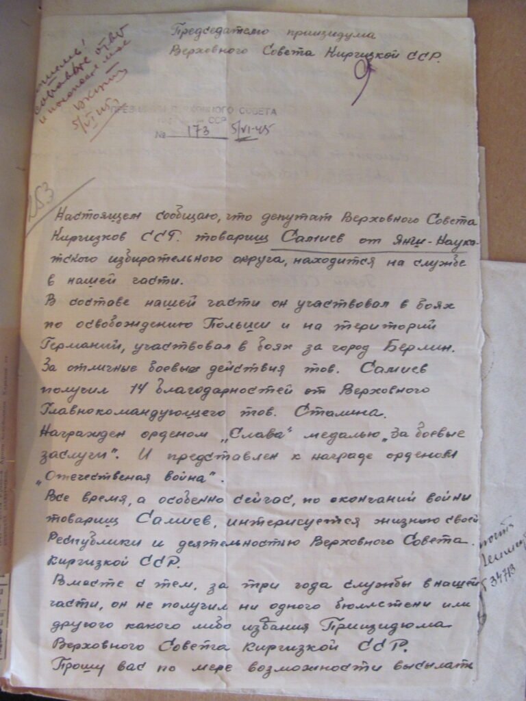 «Ал өзүнүн кол алдындагы Самиев үч жыл ичинде Жогорку Советтин бир дагы бюллетенин албаганын, бирок 1938-жылы шайланган депутат катары республиканын жашоосуна жана парламенттин ишине кызыгып жатканын жазган. Ошол эле учурда ал Жогорку Советтин ишине жүйөлүү себеп менен — Улуу Ата Мекендик согуш жылдарында фронтто болуп, өлкөнү коргоп жаткандыктан катыша алган эмес», — деп тарыхчы каттын түп нускасын редакцияга көрсөттү.