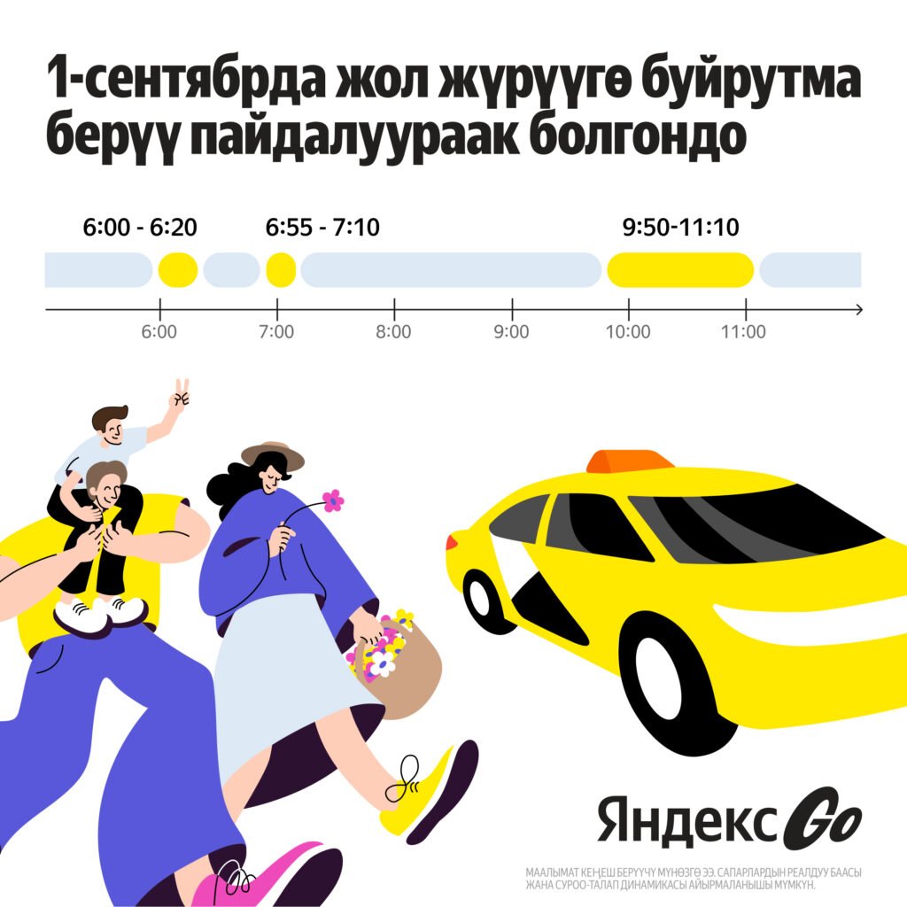 Яндекс Go былтыркы сервисти пайдалануунун маалыматына таянып, 1-сентябрда* кайсыл убакта жол жүрүүгө буйрутма берген оң болоорун алдын ала билдирди. Билим күнүндө адамдар таңкы саат 6:20дан баштап жол жүрүүгө активдүү буйрутма бере башташат, андыктан унааны бул убакытка 10-15 мүнөт калганда, эрте чакырган оң. Суроо-талаптын бир аз төмөндөшү 6:55тен 7:10го чейин байкалат, бул учурда жүрүүнүн баасы бир аз төмөн болушу мүмкүн. Сервиске жол жүрүүгө буйрутма берүүнүн суроо-талабы адатта саат 9:50дөн кийин төмөндөйт.
