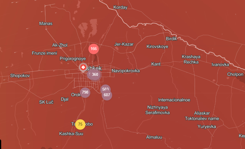Учурдагы AQI индекси 449 бирдикти түзөт. Эл аралык классификацияга ылайык, булгануунун мындай деңгээли «өтө зыяндуу» болуп эсептелет. Бирок Чоң-Арык сыяктуу айрым райондордо абанын сапаты дээрлик 800 AQIге жетип жатат — бул абанын катастрофалык түрдө жогорку булгануу деңгээли жана ден соолук үчүн өзгөчө коркунучту билдирет.