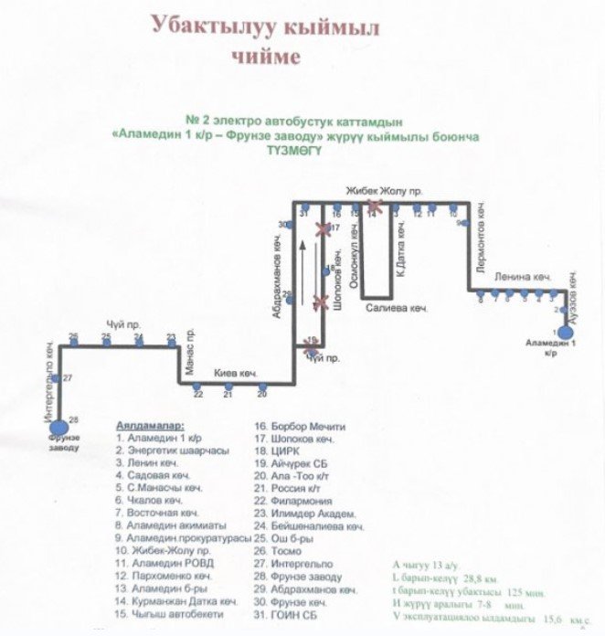 №2 маршрут Аламүдүн-1 кичи районунан Фрунзе заводуна (Интергельпо көчөсү) чейин жүрөт.