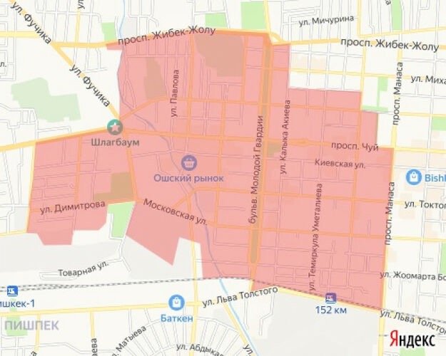 Суу жок боло турган аймактар төмөнкү көчөлөр менен чектелет: