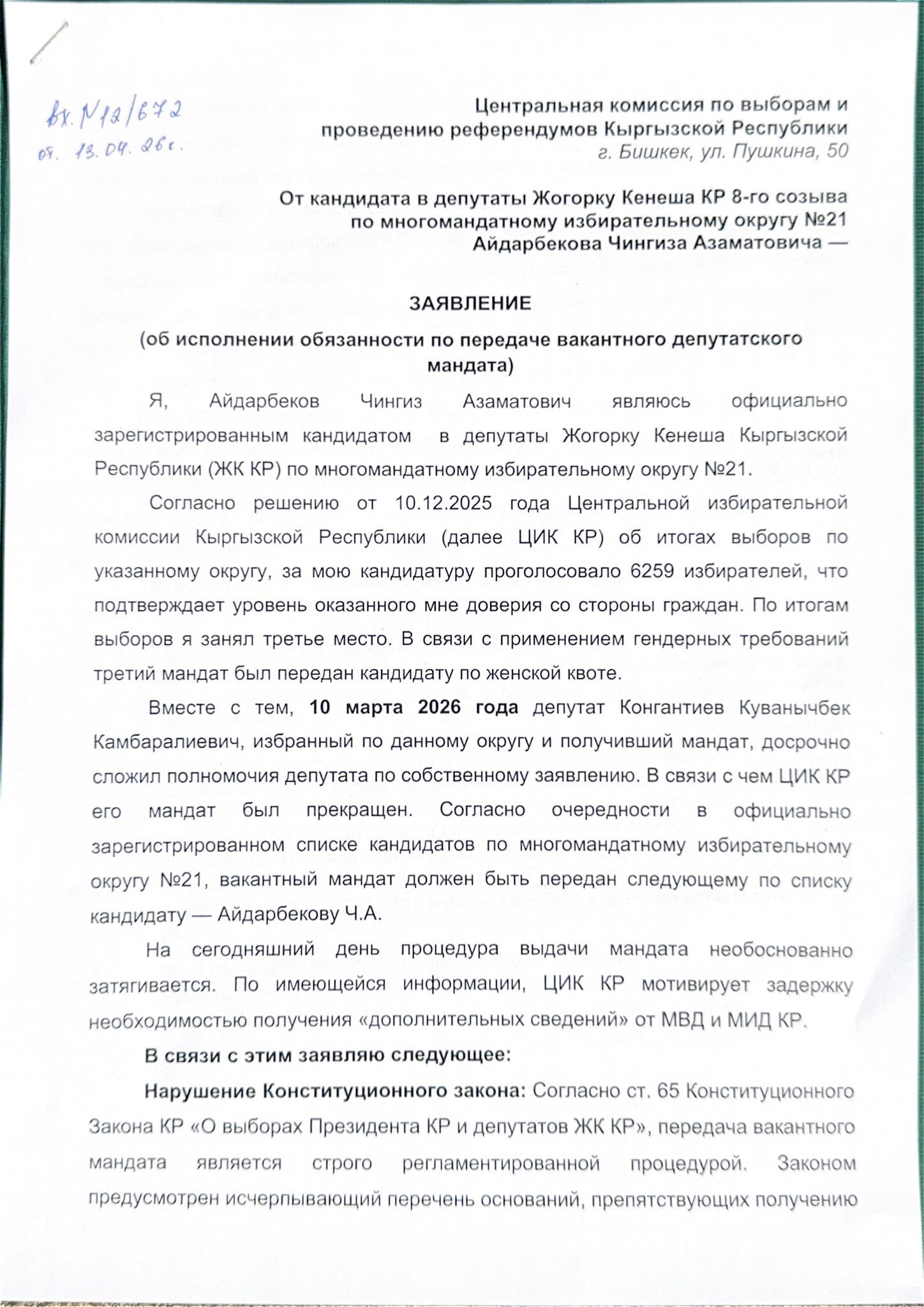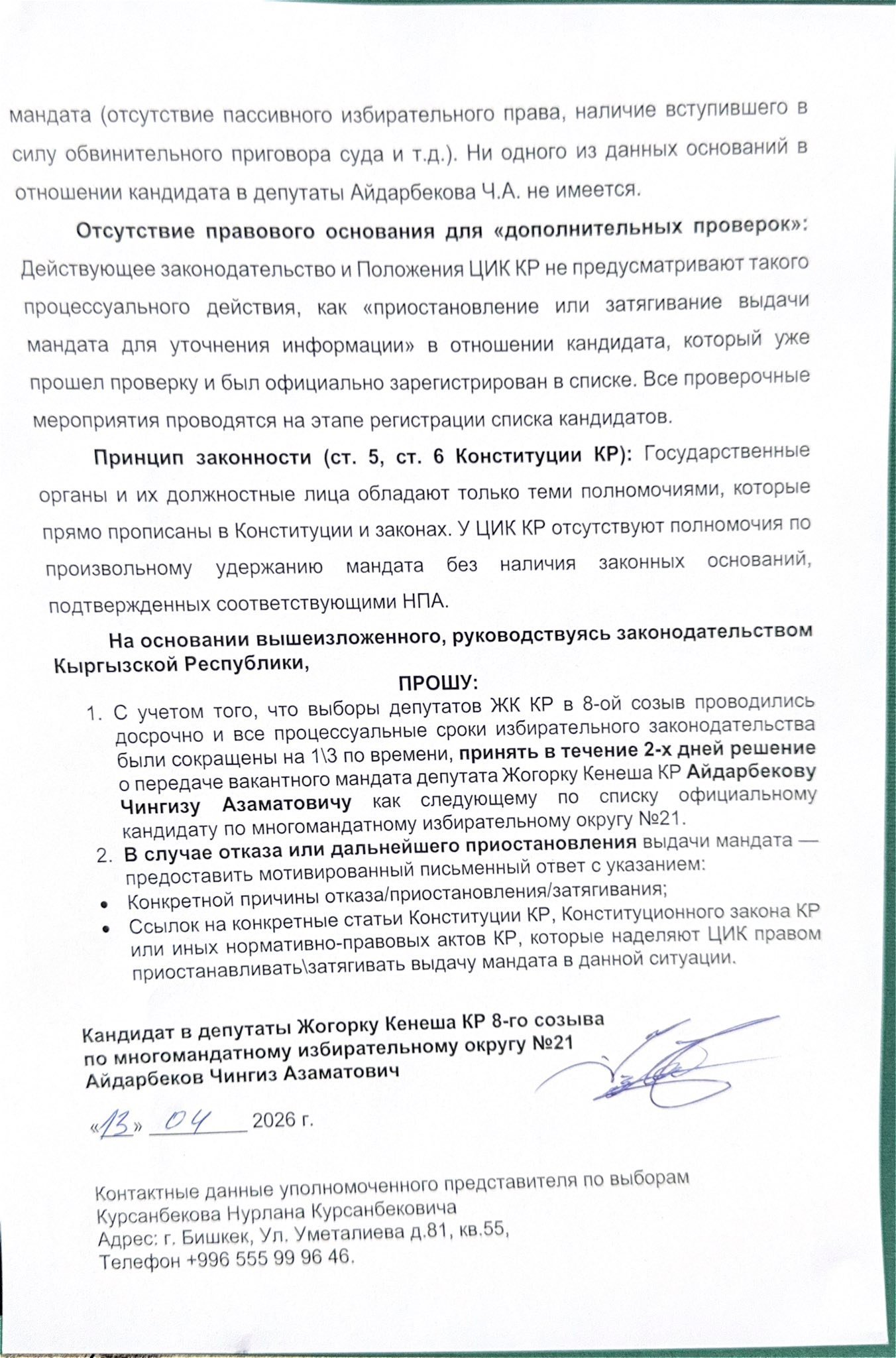 “Бүгүнкү күндө мандат берүү жол-жобосу негизсиз создуктурулуп жатат. Колдо бар маалыматтарга караганда, БШК бул кечиктирүүнү ИИМ жана ТИМден “кошумча маалыматтарды” алуу зарылдыгы менен негиздөөдө”, – деп айтылат Айдарбеков жарыялаган арызда.