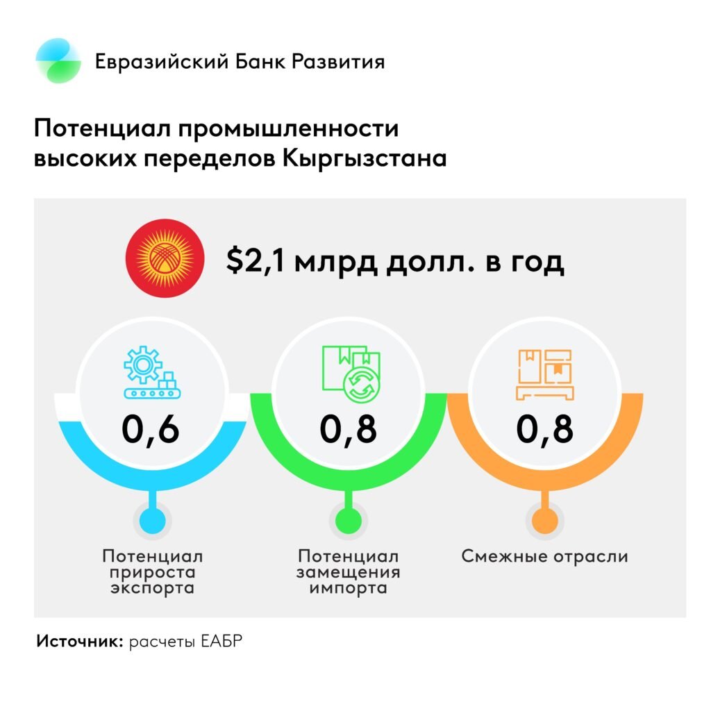 Евразия өнүктүрүү банкынын (ЕАӨБ) жаңы изилдөөсү көрсөткөндөй, Кыргызстан өнөр жай өндүрүшүн жылына 2,1 млрд долларга көбөйтүүгө жөндөмдүү. Алардын айтымында, ал үчүн жөн гана чийки зат казуу эмес, кайра иштетүүнү өнүктүрүү жана ЕАЭБ чынжырларына кошулуу зарыл.
