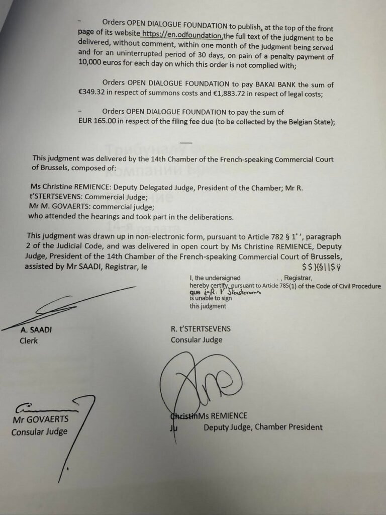 «Бакай Банк» жалган айыптоолору үчүн ODF уюмун сотко берип, сот банктын пайдасына чечим чыгарды. Брюсселдин француз тилдүү ишкердик соту «Ачык диалог фонду» жетиштүү конкреттүү далилдерди келтирбестен олуттуу жана максаттуу айыптоолорду койгон деген тыянакка келген.