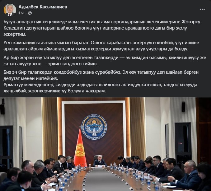 Министрлер кабинетинин жетекчиси Адылбек Касымалиев бүгүн, 25-ноябрда, болуп өткөн аппараттык жыйында мамлекеттик органдардын жетекчилерине Жогорку Кеңеш депутаттарын шайлоо алдындагы үгүт иштерине кийлигишпөөнү бир жолу эскертти. Бул тууралуу ал Фейсбуктагы баракчасында билдирди.
