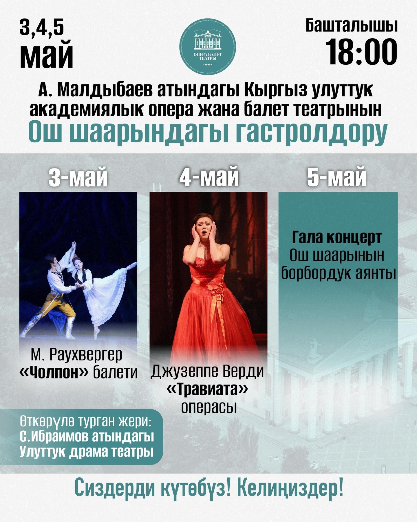 Раухвергердин «Чолпон» балети көрсөтүлөт. - 4-май: Ош улуттук драма театрында Дж. Вердинин «Травиата» операсы коюлат.