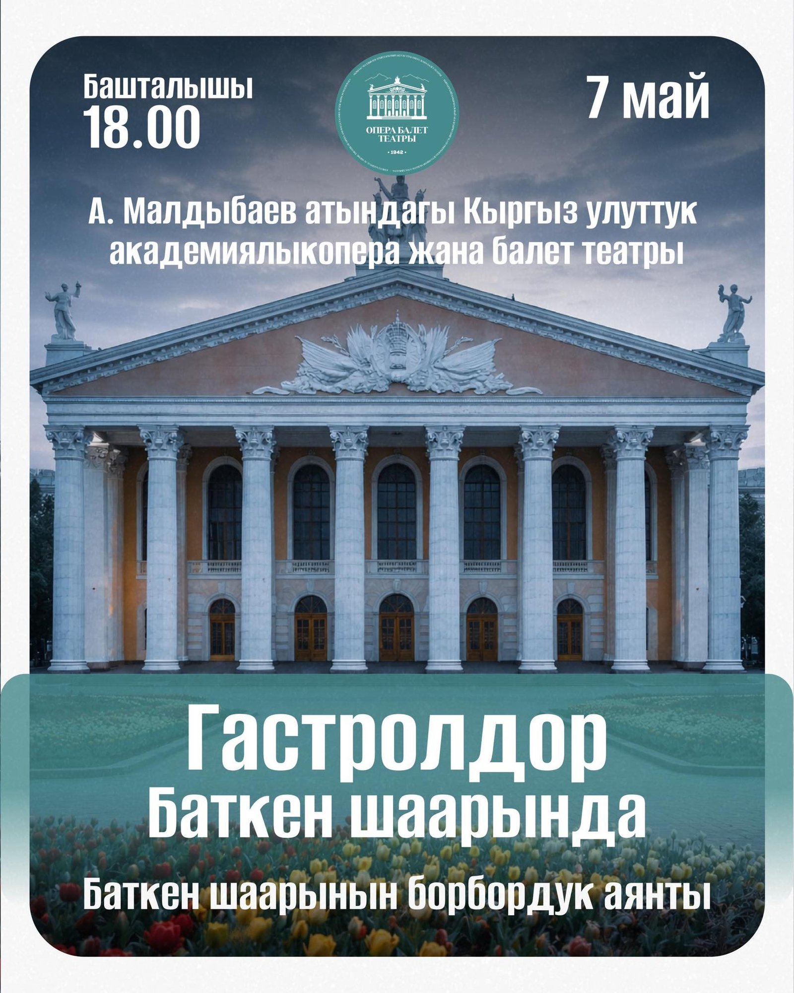 А. Малдыбаев атындагы Кыргыз улуттук академиялык опера жана балет театры 3-майдан 9-майга чейин Ош, Баткен жана Манас шаарларында гастролдук сапарда болот. Маданият министрлигинин маалыматында, гастролдорго театрдын солисттери, оркестри жана чыгармачыл жамааты толук курамы менен катышат. Бардык көрсөтүүлөргө жана концерттерге кирүү акысыз.