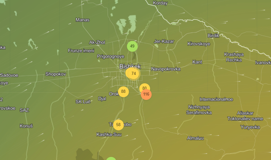 По состоянию на 23 января столица Кыргызстана заняла 56-ю строчку в мировом рейтинге качества воздуха (World Air Quality Index).