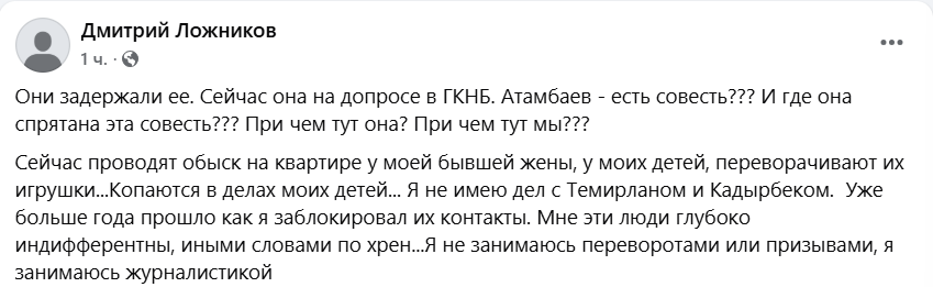 В своем заявлении Ложников подчеркнул, что не имеет никакой связи с Темирланом Султанбековым и Кадыром Атамбаевым.