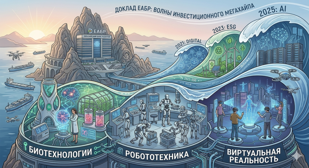Евразийский банк развития (ЕАБР) в докладе «Волны инвестиционного мегахайпа» определил наиболее вероятные направления следующей глобальной технологической волны. После пиков digital (2021 год), ESG (2023 год) и AI (2025 год) аналитики выделяют биотехнологии, робототехнику и виртуальную реальность. По оценкам, рынок биотеха вырастет с $1,9–2,2 трлн в 2024–2025 годах до $5,9 трлн к 2034 году, робототехники — с $64,8 млрд до $376 млрд к 2035 году, а виртуальной реальности — с $75 млрд до $693 млрд соответственно.
