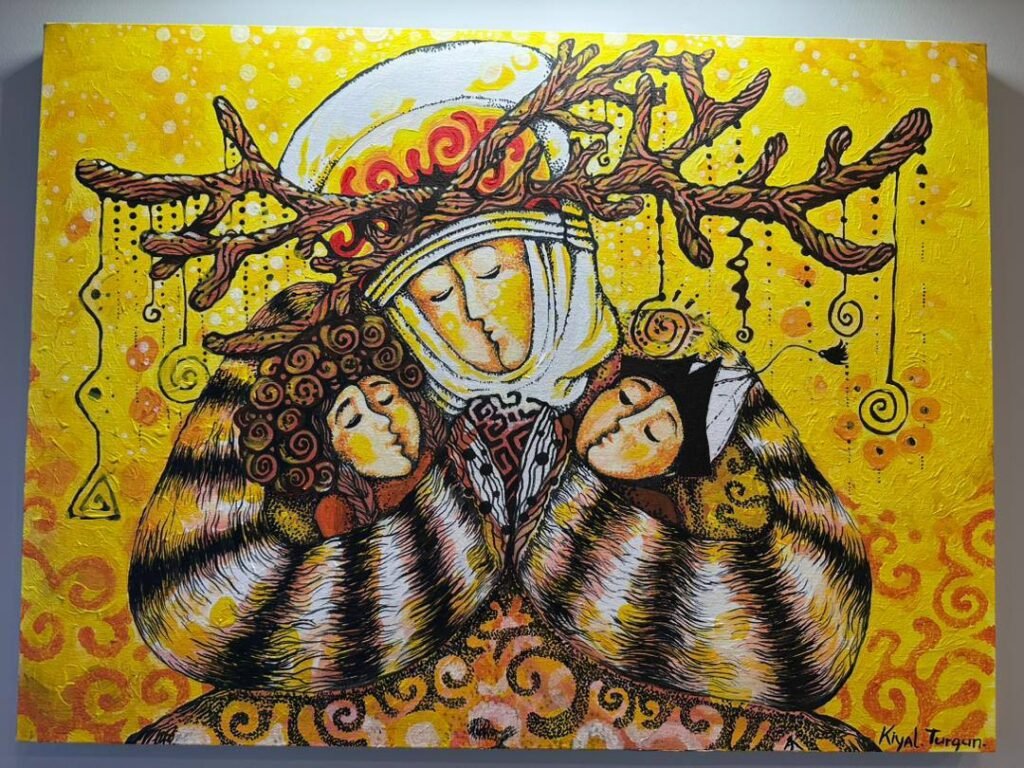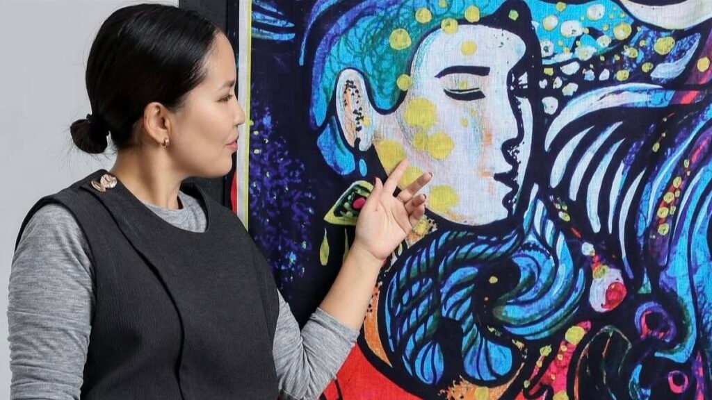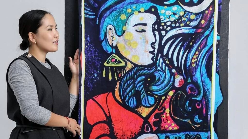 В Бишкеке, в Музее искусств имени Гапара Айтиева, проходит пятая выставка Союза дизайнеров Кыргызстана. Экспозиция объединила станковую живопись, графический дизайн и модели одежды. Хотя организаторы не задавали тематического вектора, в центре внимания зрителей неожиданно оказались размышления о роли женщины в национальной культуре и истории. Одной из самых заметных участниц смотра стала Кыял Аккучукова, представившая три живописных полотна и коллекцию авторских платков «Акжолтой». В беседе с Reporter.kg художница объяснила, почему героиню эпоса «Манас» можно считать первыми феминистками, как не стать жертвой плагиата и зачем рисовать «солнце внутри».