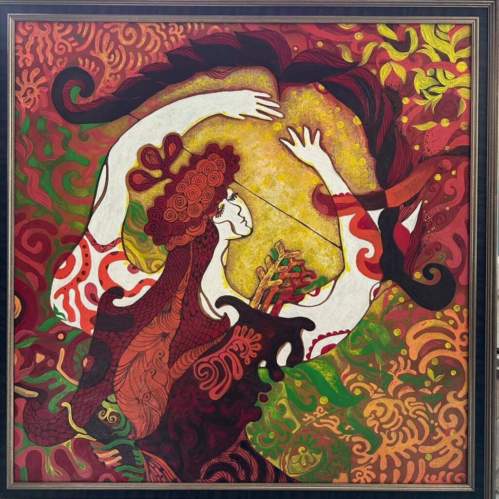 — Работа выполнена акрилом и маслом. Образ Сайкал интересовал меня с детства: это женщина, которая бросила вызов Манасу и почти победила его в поединке. Если рассматривать этот сюжет в современном контексте, она — первая кыргызская феминистка. Согласно эпосу, она сознательно не стала демонстрировать всю свою силу, остановившись из уважения к противнику. Мне кажется, такое сочетание силы и мудрости сегодня востребовано в обществе.