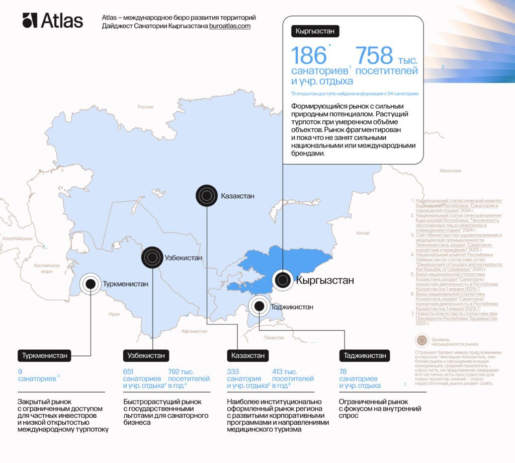 Санаторный туризм в Кыргызстане перестает быть историей о советском наследии и устаревшей инфраструктуре. Сейчас рынок в точке перехода от социальной модели к коммерческой, от государственного управления к частно-государственному партнерству, от сезонного отдыха к круглогодичным wellness-курортам.