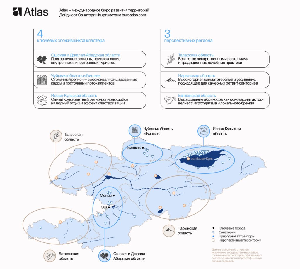 Санатории Кыргызстана могут встроиться в глобальный тренд longevity и биохакинга, многие регионы (от Нарынской до Баткенской области) имеют скрытый потенциал, и инвесторы могут присмотреться практически к любым форматам, от камерных эко-санаториев с кумысолечением и конными маршрутами, до трансформации советских здравниц в 5-звездочные курорты.