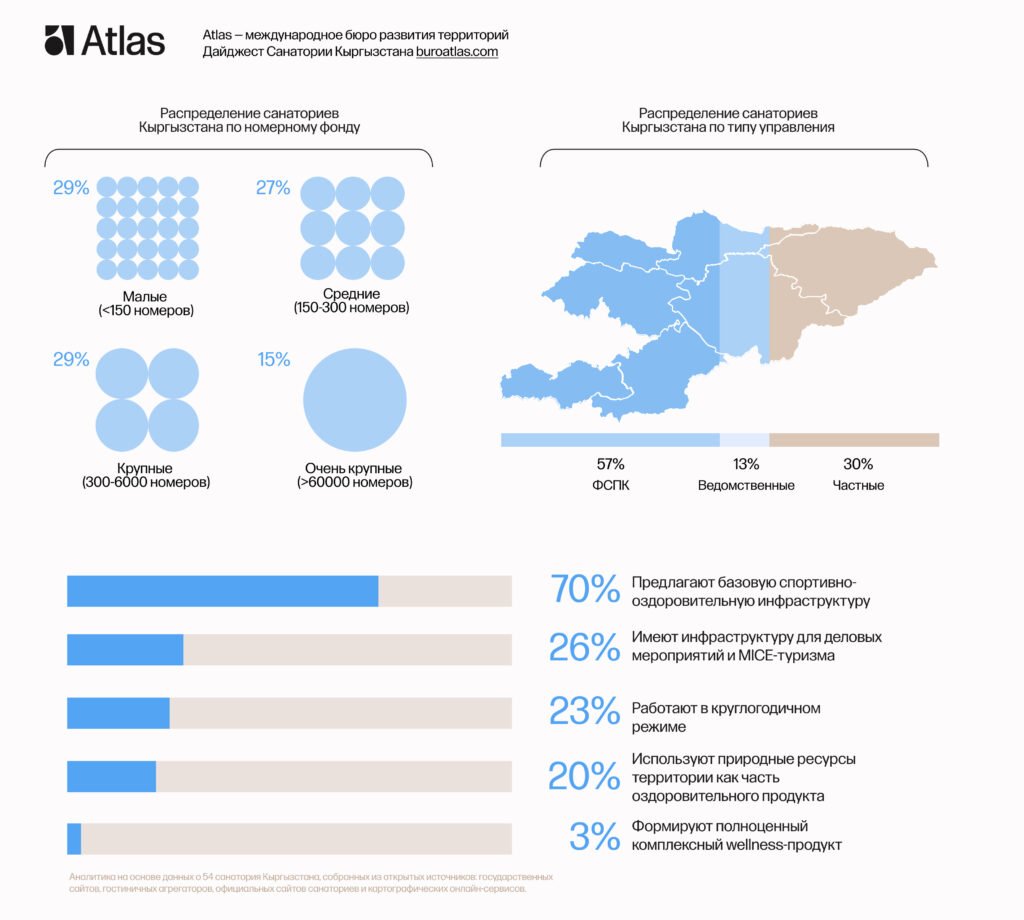 Выводы исследования вкратце таковы: рынок санаторно-курортных услуг Кыргызстана оказался в двойственной ситуации. На фоне рекордного турпотока в стране и мирового бума wellness-туризма, где средний чек на 35% выше стандартного, подавляющее большинство местных здравниц не могут предложить платежеспособному гостю современный продукт. Почти все, 97% санаториев страны, не формируют полноценного wellness-предложения, ограничиваясь базовой советской программой лечения или спонтанным набором услуг. При этом физический износ объектов еще недавно достигал критического значения. Государство привлекло десятки миллионов доларов на их модернизацию и создание новых проектов, в том числе через специально созданную дирекцию.