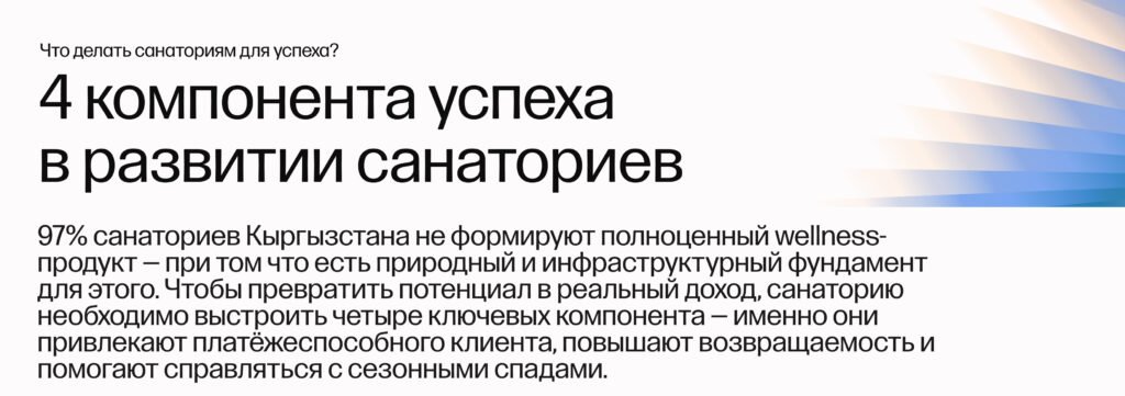 Для девелоперов это означает возможность работать не с отдельными объектами, а с созданием новых туристических экосистем — от курортных комплексов до целых рекреационных территорий. Первый, кто соберет санаторий нового поколения в Кыргызстане, сделает это при минимальной конкуренции и на льготных условиях.