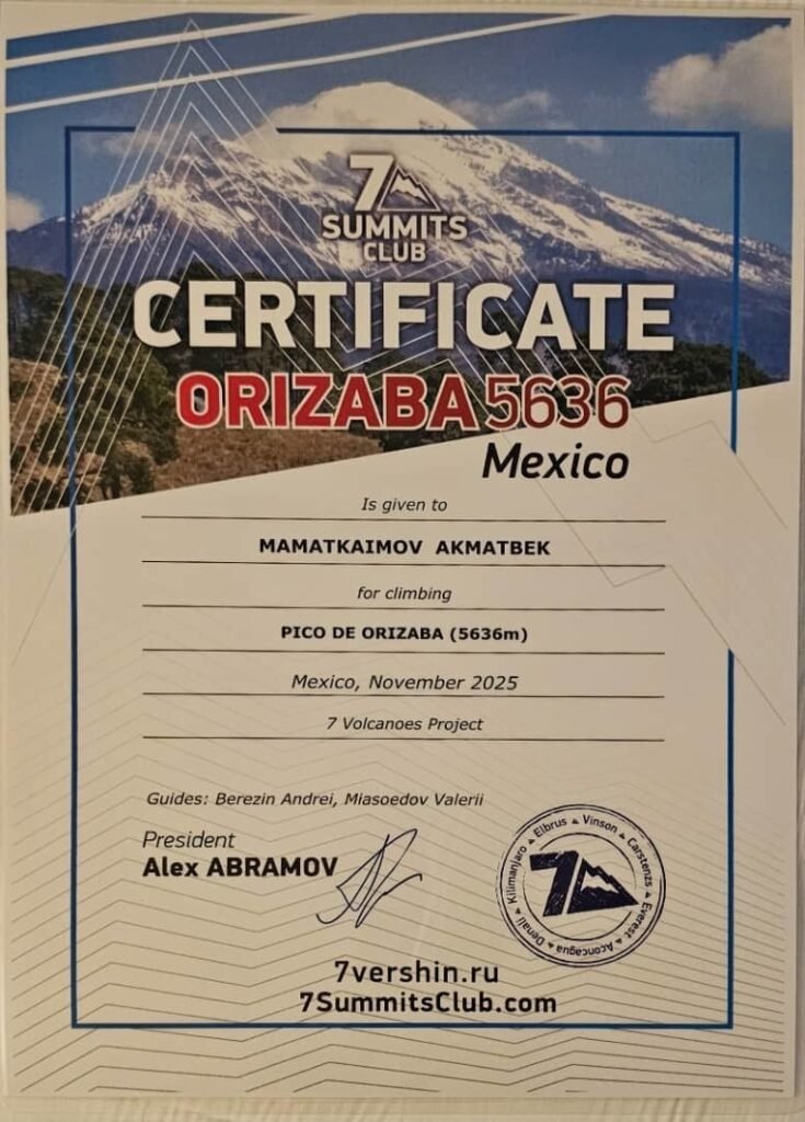 Кыргызстанский альпинист Акматбек Маматкаимов 23 ноября совершил успешное восхождение на самую высокую точку Мексики — вулкан Орисаба. О своем достижении он сообщил в соцсетях.