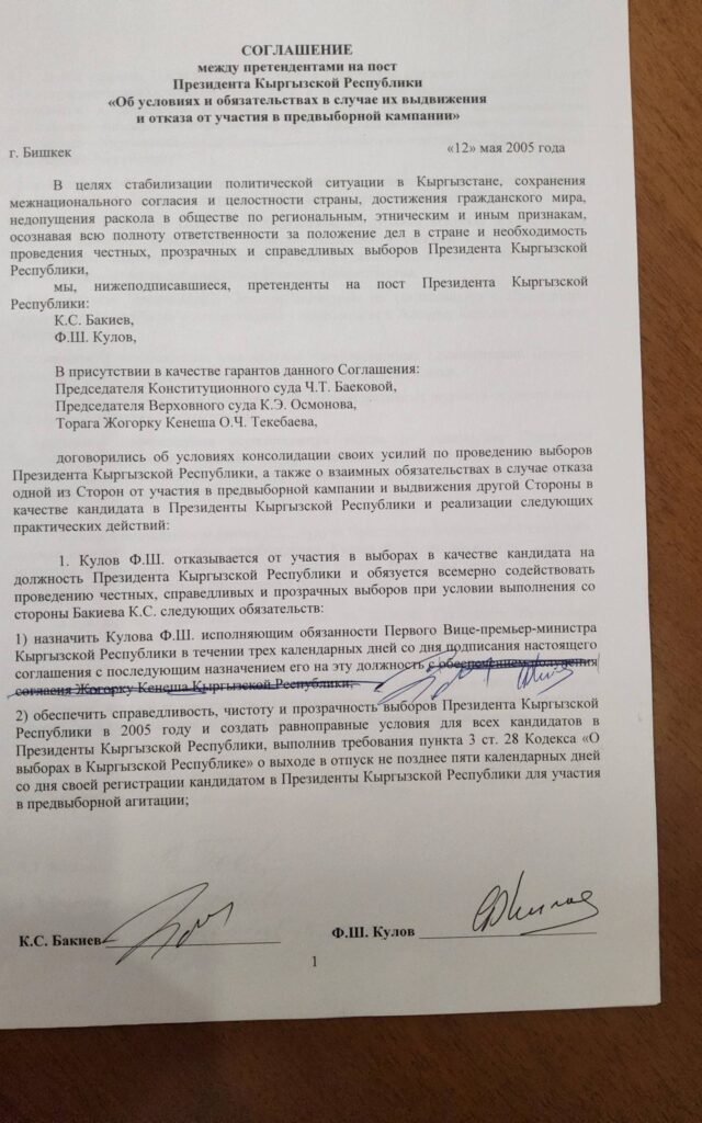 «В соглашении был пункт, предусматривающий, что в случае избрания Бакиева на должность президента он назначает меня на должность премьер-министра, которую я буду занимать до тех пор, пока он будет президентом. Эти слова в соглашении Бакиев собственноручно зачеркнул», — написал Кулов.