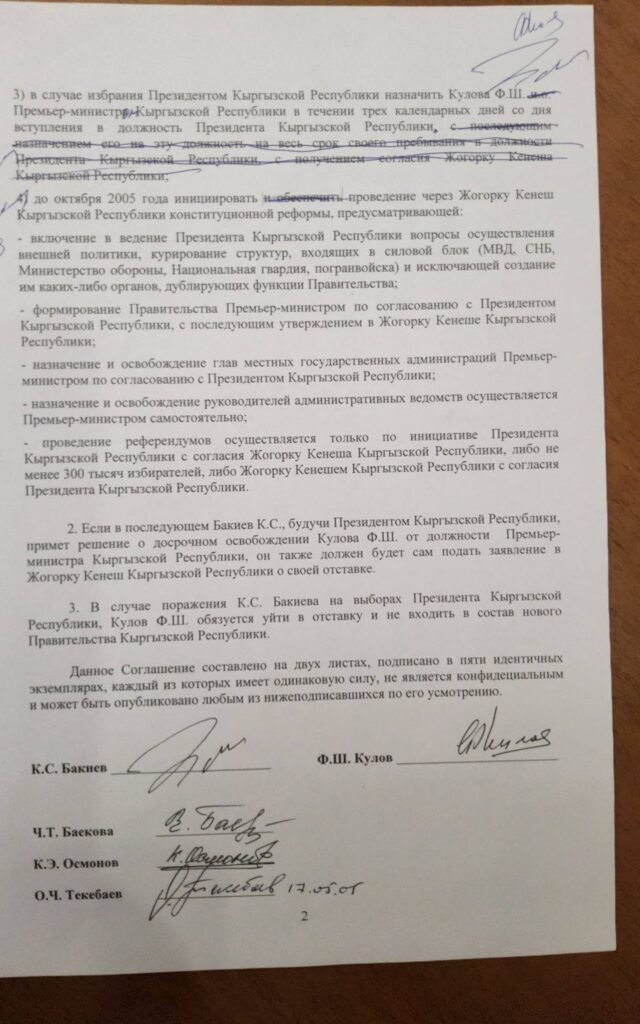 Отметим, что документ, помимо Кулова и Бакиева, в качестве гарантов подписали спикер Жогорку Кенеша и главы судебной ветви власти.