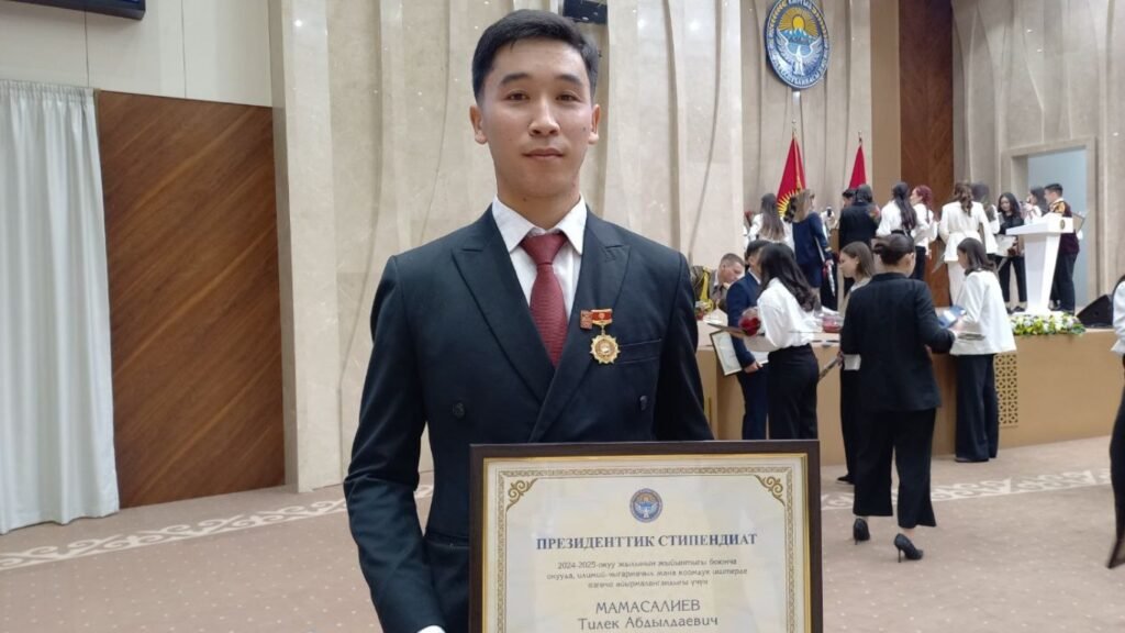 «С первого курса у меня все оценки были «отлично». Помимо учебы, я активно участвовал в мероприятиях, научных конференциях, общественной деятельности, писал статьи, и сегодня получил стипендию из рук президента. В будущем собираюсь работать по специальности, а потом, возможно, вы увидите меня в Жогорку Кенеше», — сказал он.