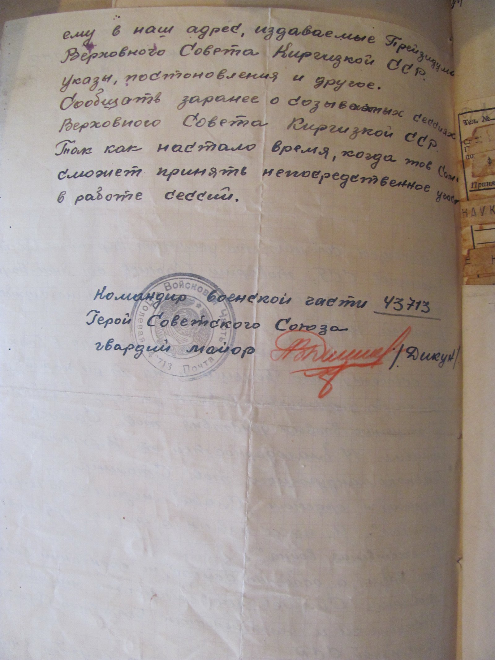 Сумароков также рассказал и о письме командира части, Героя Советского Союза Георгия Дикуна в президиум Верховного Совета Киргизской ССР в июне 1945 года.