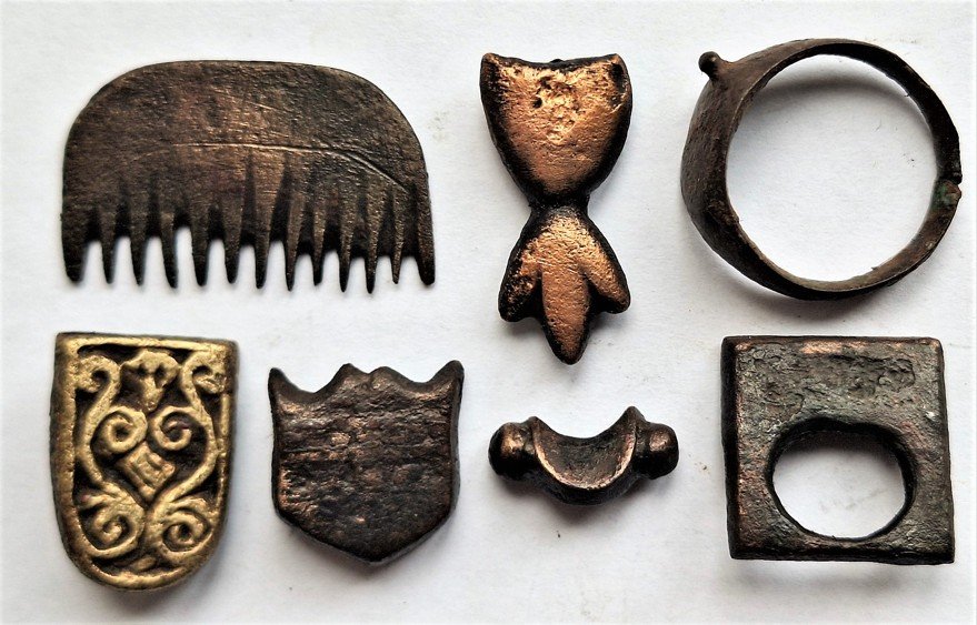 Интересна находка бракованной накладки с вертикальным валиком. Брак — лучшее доказательство местного производства. То есть в городе работали свои литейщики, не только привозные мастера. Это уже не просто торговая фактория, а ремесленный центр. Найдено и согдийское бронзовое кольцо, довольно примитивный бронзовый гребень — бытовая повседневность, которая и составляет «ткань истории».