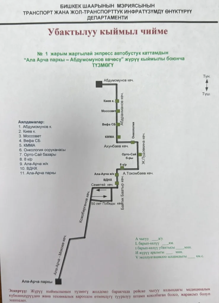 По данным муниципального предприятия «Бишкекский городской транспорт», со 2 сентября 2025 года маршрут автобуса №1 изменен.