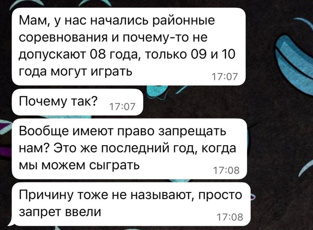 По словам женщины, ее 17-летний сын вместе с друзьями готовился к турниру, но сегодня, 11 ноября, им сообщили, что школьники 2008 года рождения не могут принять участие в соревнованиях.