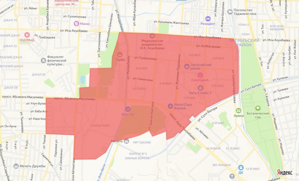 проспект Ч. Айтматова — улица Абдрахманова — улица Бакаева — проспект Масалиева — улица Токтоналиева — парк Ата-Турк — улица Ахунбаева — река Аламедин — Южный Большой Чуйский канал — улица Б. Баатыра — река Ала-Арча — улица Семетей.
