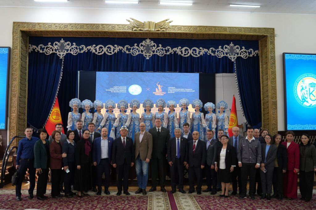 Одним из ключевых событий дня стало торжественное открытие в стенах университета тематической аудитории — «Исторического пространства Великой Отечественной войны». Кабинет оборудован двуязычными стендами, которые подробно рассказывают о вкладе Киргизской ССР в общую Победу: от ратных подвигов на фронте до самоотверженного труда в тылу.