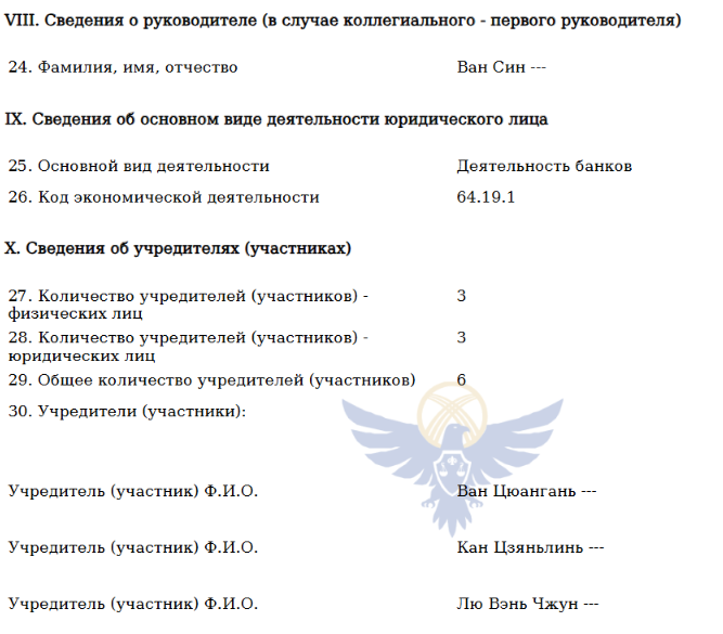 Согласно учредительным документам, банк создан с привлечением иностранного капитала. В состав учредителей вошли трое граждан Китайской Народной Республики: Ван Цюангань, Кан Цзяньлинь и Лю Вэнь Чжун. Председателем правления финансовой организации назначен Ван Син.