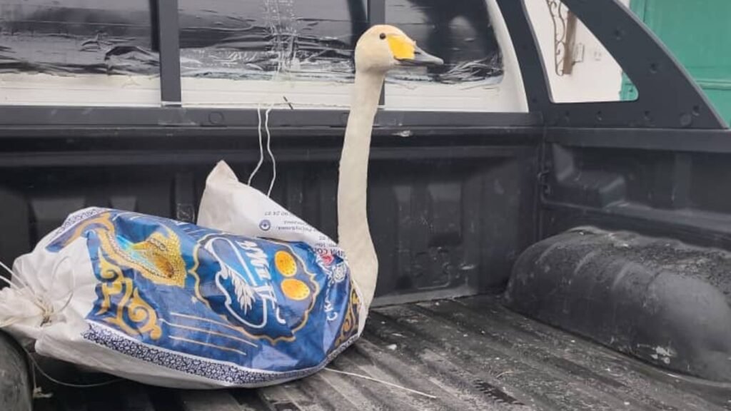 По данным Министерства природных ресурсов, птица находилась на пашне в селе Шабдан, примерно в двух километрах от парка. Местные жители поймали лебедя и передали сотрудникам парка.