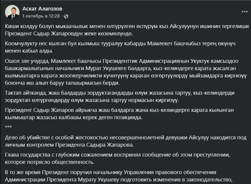 Осенью 2025-го от имени президента высказался его пресс-секретарь Аскат Алагозов: «Садыр Жапаров считает, что, особенно преступления против детей и женщин, не должны оставаться безнаказанными».
