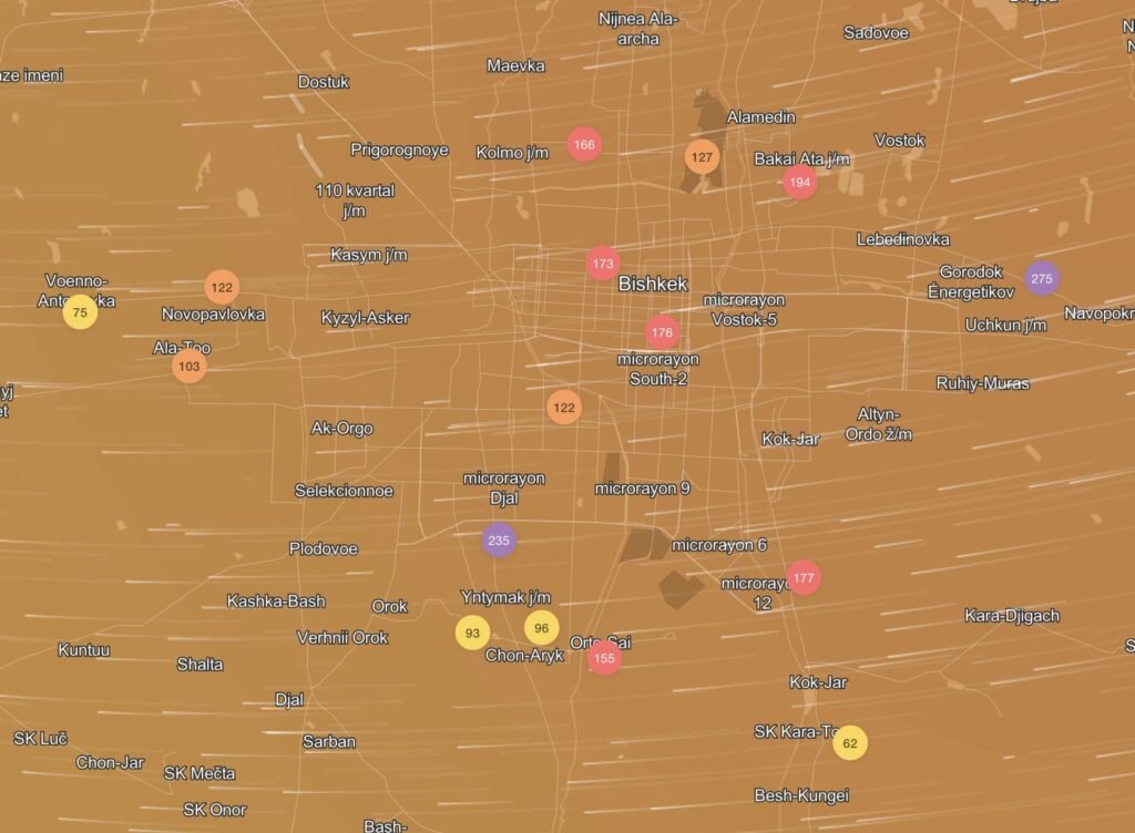 Декабрда жана январда Бишкек PM2.5 булгануу деңгээли боюнча дүйнөлүк антирейтингдерде бир нече жолу алдыга чыккан. Акыркы жылдары абанын сапаты кыштын эң олуттуу темасына айланды. Шаарды кара түтүн каптаганын түшүнүү үчүн бишкектиктерге тиркемелердин деле кереги жок — терезени кароо же жөн эле сыртка чыгуу жетиштүү, ал жакта дем алуу физикалык жактан оор.