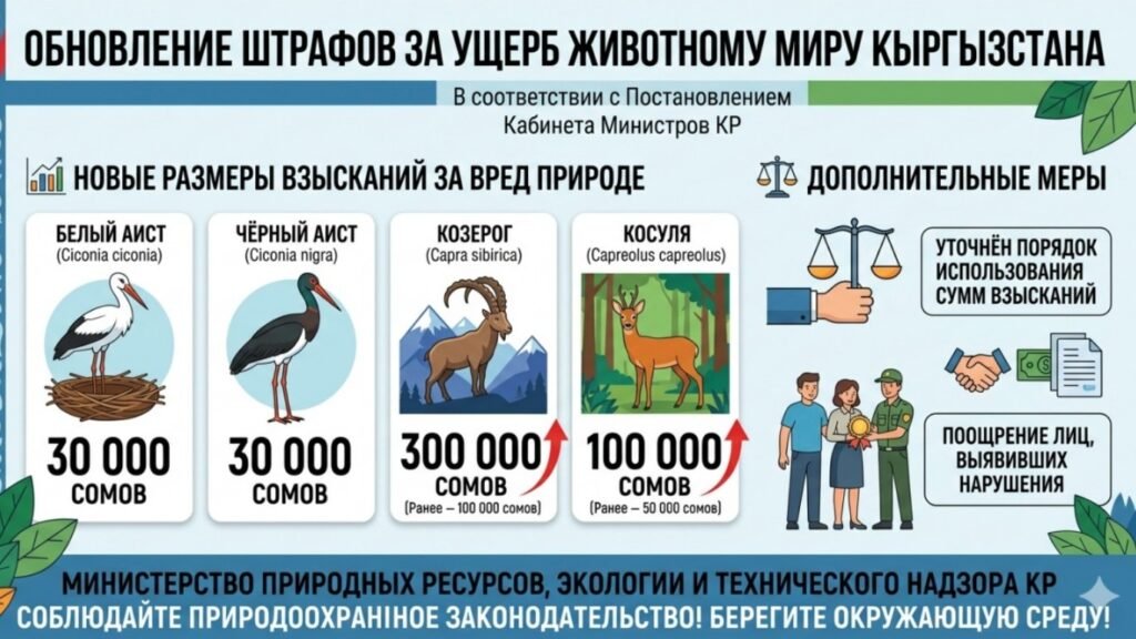 Министрлер кабинети жаныбарлар дүйнөсүнө зыян келтиргендерге айып пулдардын өлчөмүн жогорулатуу жөнүндө токтом кабыл алды. Бул тууралуу Жаратылыш ресурстары, экология жана техникалык көзөмөл министрлиги билдирди.
